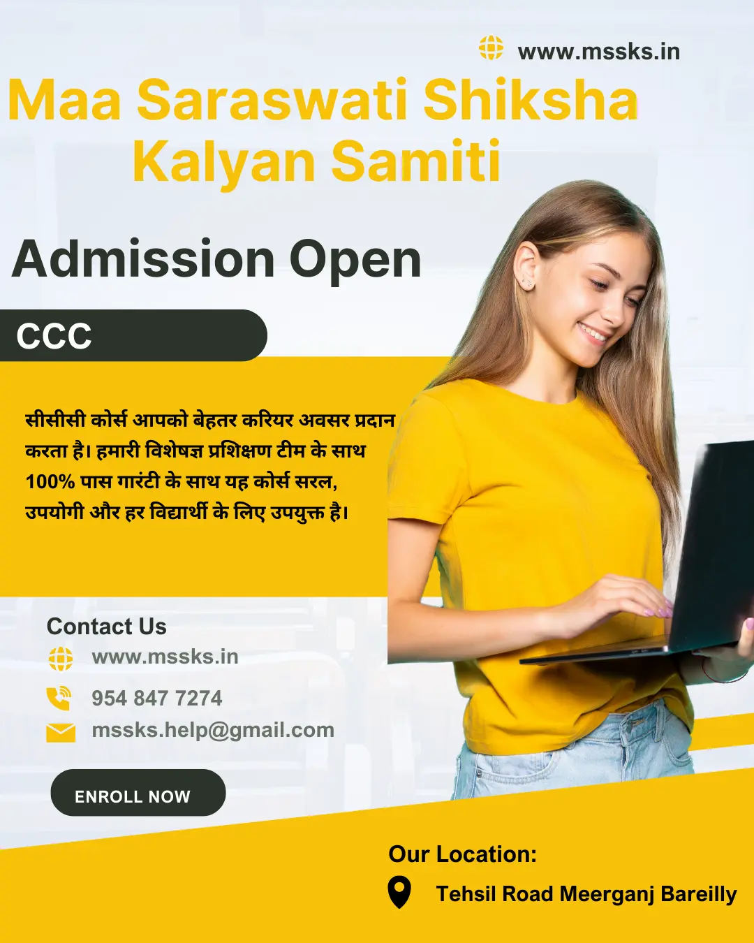 Maa Saraswati Shiksha Kalyan Samiti (MSSKS) is a dedicated educational institute committed to empowering students with knowledge, skills, and values that prepare them for a successful future. we believe that quality education is the foundation for personal and professional growth. Our mission is to make education accessible, affordable, and career-oriented for all learners. We offer a wide range of academic and computer-oriented courses, including programs such as ADCA (Advanced Diploma in Computer Applications), DCA (Diploma in Computer Application), Photoshop, CorelDraw, Hindi Typing, English Typing, CCC, O Level and other skill-based certifications designed to enhance employability in today’s digital world. With experienced faculty, practical training modules, and a supportive learning environment, MSSKS ensures that every student gains not only theoretical understanding but also hands-on experience. We strive to create a platform where students can learn, grow, and achieve excellence in their chosen fields. Whether you are looking to enhance your technical skills or build a strong educational foundation, MSSKS is your trusted partner in education. Join us and take the next step toward your bright future with Maa Saraswati Shiksha Kalyan Samiti.